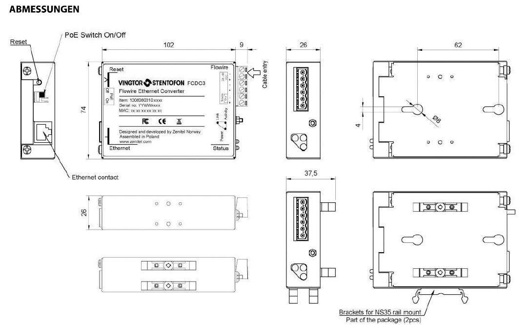 1 Adernpaar für Datenübertragung und PoE-Spannungsversorgung Endgerät, Übertragungsrate max. 100 MBit/s, funktioniert mit allen Ethernet-Endgeräten (nicht nur VS Produkte), vorhandene 2-Draht-Infrastruktur kann weiterverwendet werden, Ausgangsleistung max. 15 Watt, Schutzart IP 20, Wandmontage oder DIN-Schiene, Versorgung über externes Netzgerät, Wichtig: 24V DC non-PoE für EX-Geräte