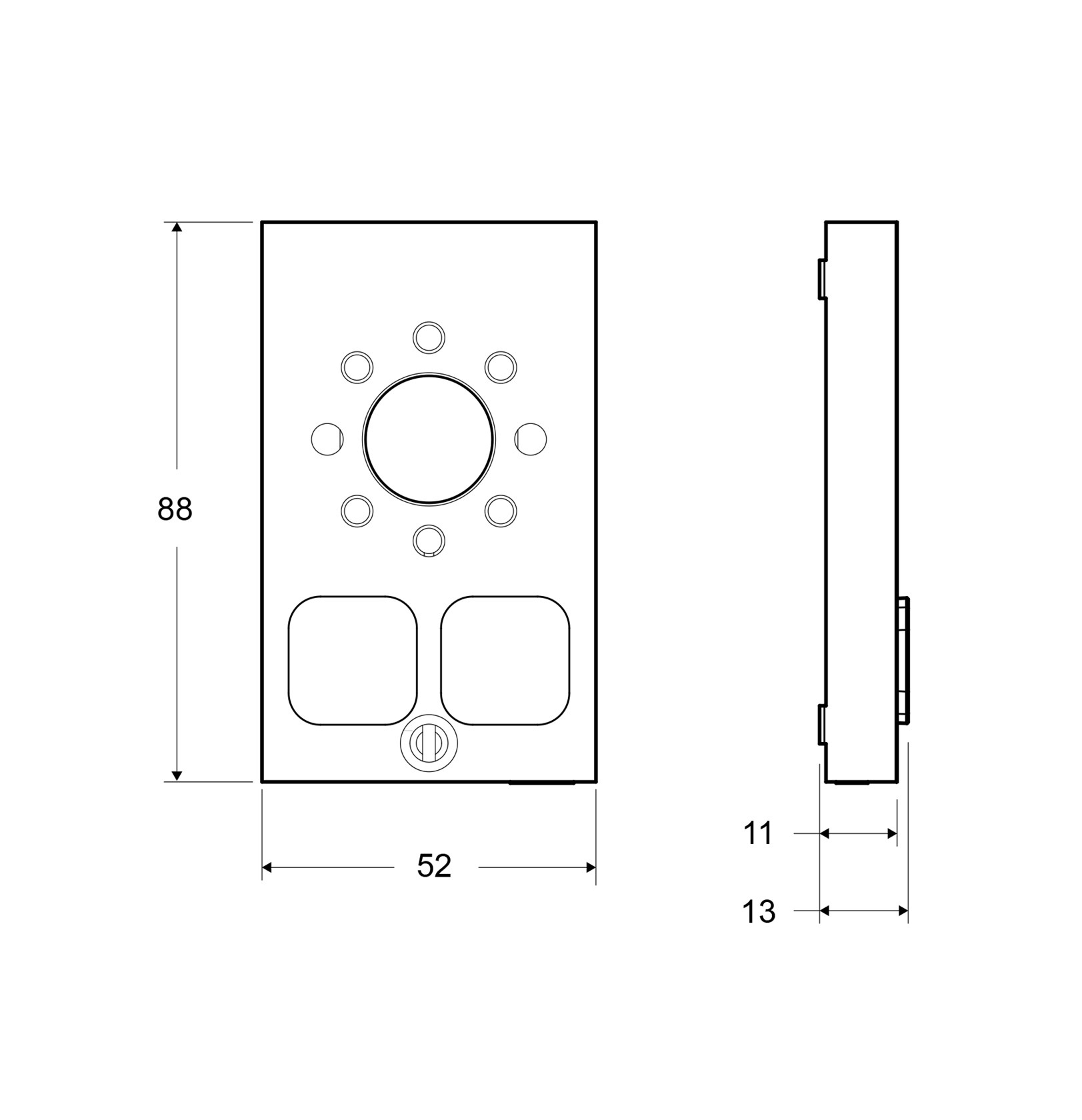 Emergency call system for mounting behind the COP. Dimensions (H x W x D): 88 x 53 x 14 mm