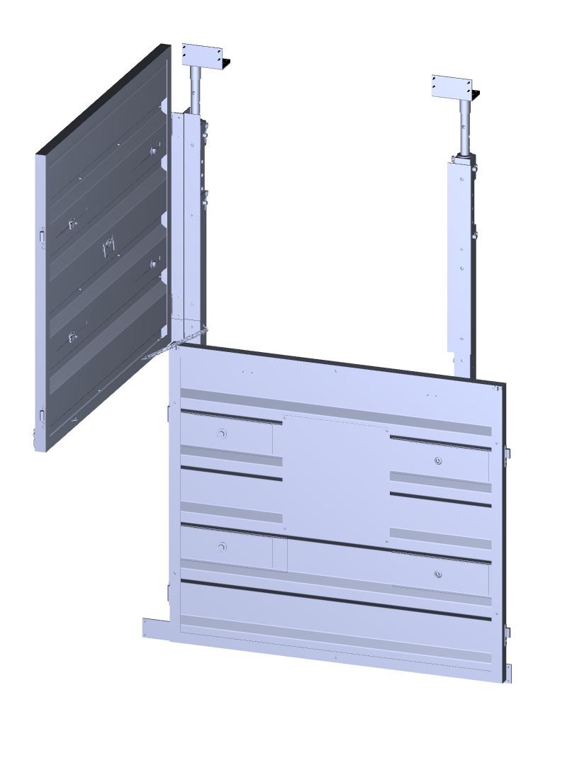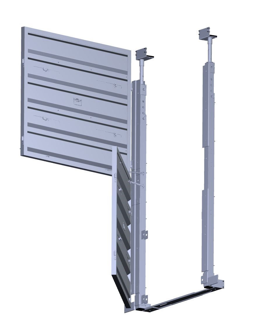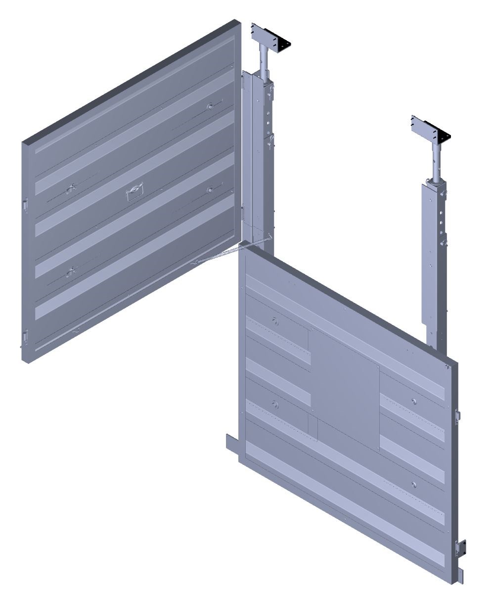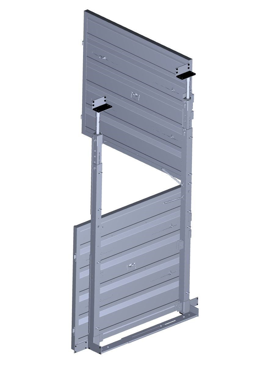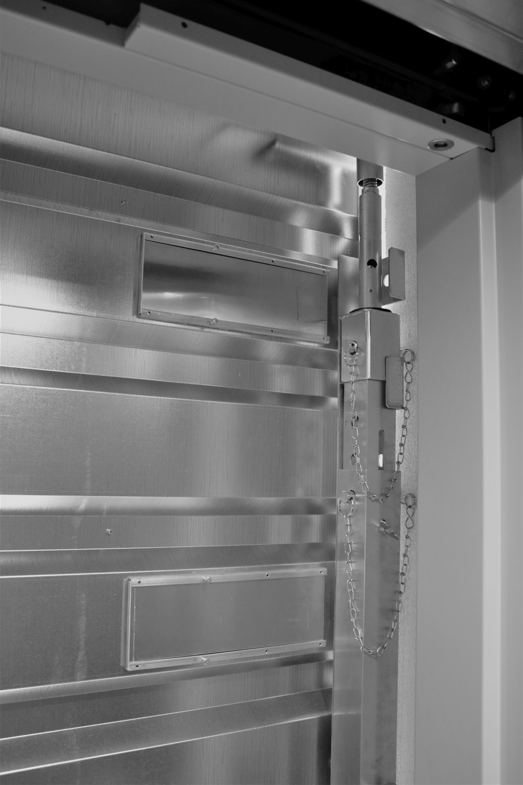 Full-surface, two-part hinged swing door made of sheet steel and aluminium. Consisting of two swing doors, each with two 3-edge locks, two vertical aluminium supports crimped between the threshold and lintel as well as a transversal sill bar to secure the position.