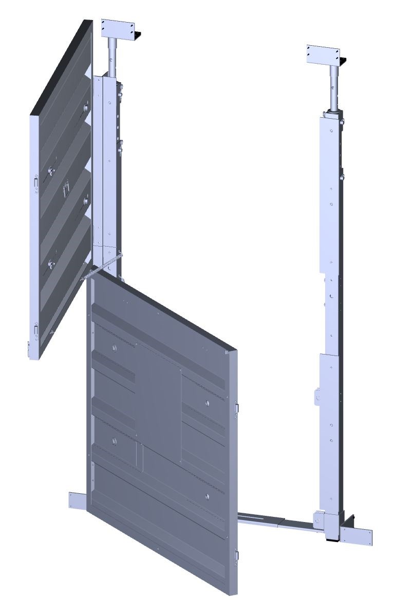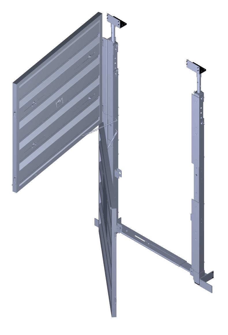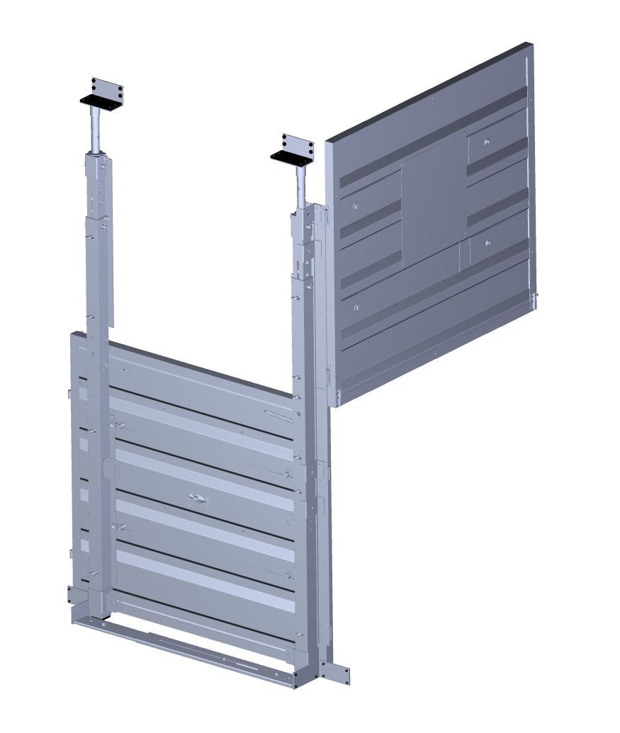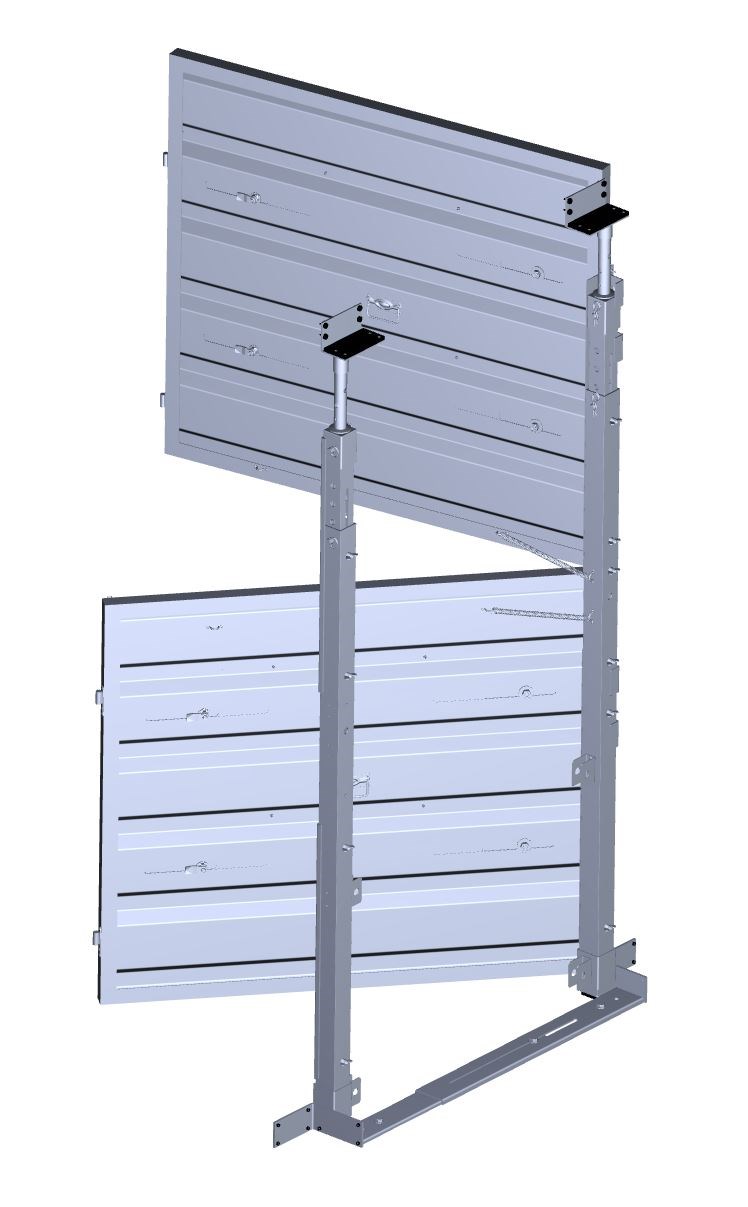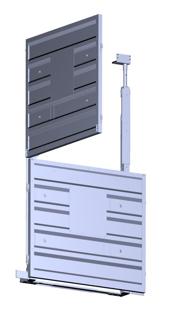 Full-surface, two-part hinged swing door made of sheet steel and aluminium. Consisting of two swing doors, each with two 3-edge locks, two vertical aluminium supports crimped between the threshold and lintel as well as a transversal sill bar to secure the position.
