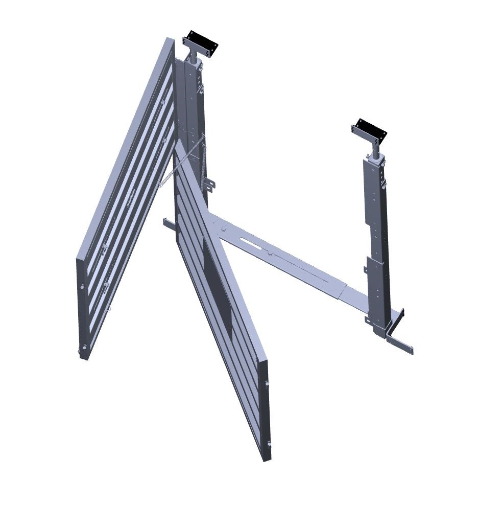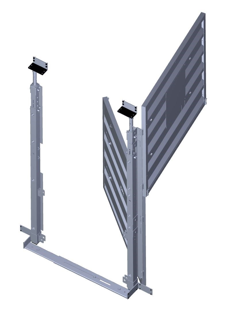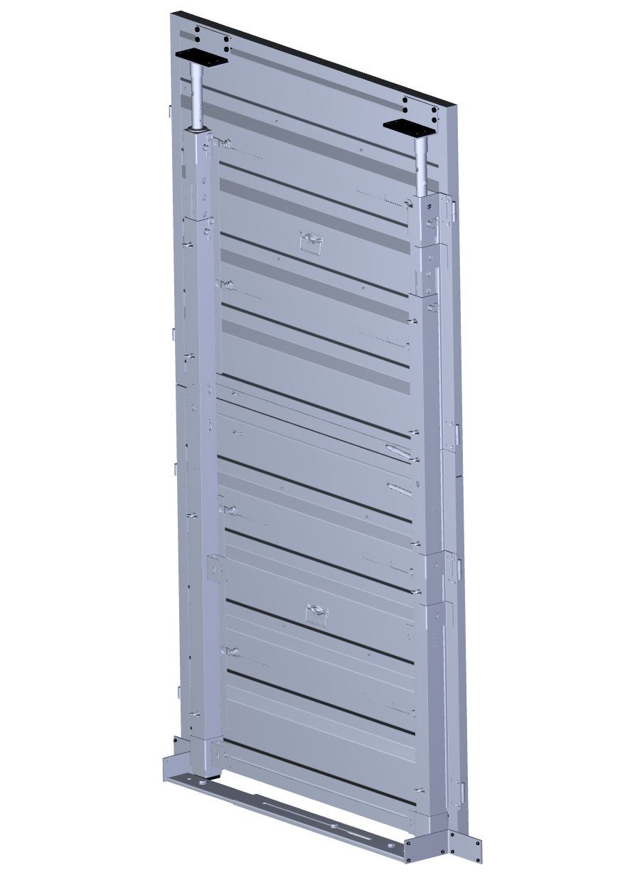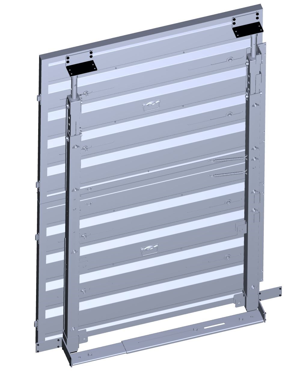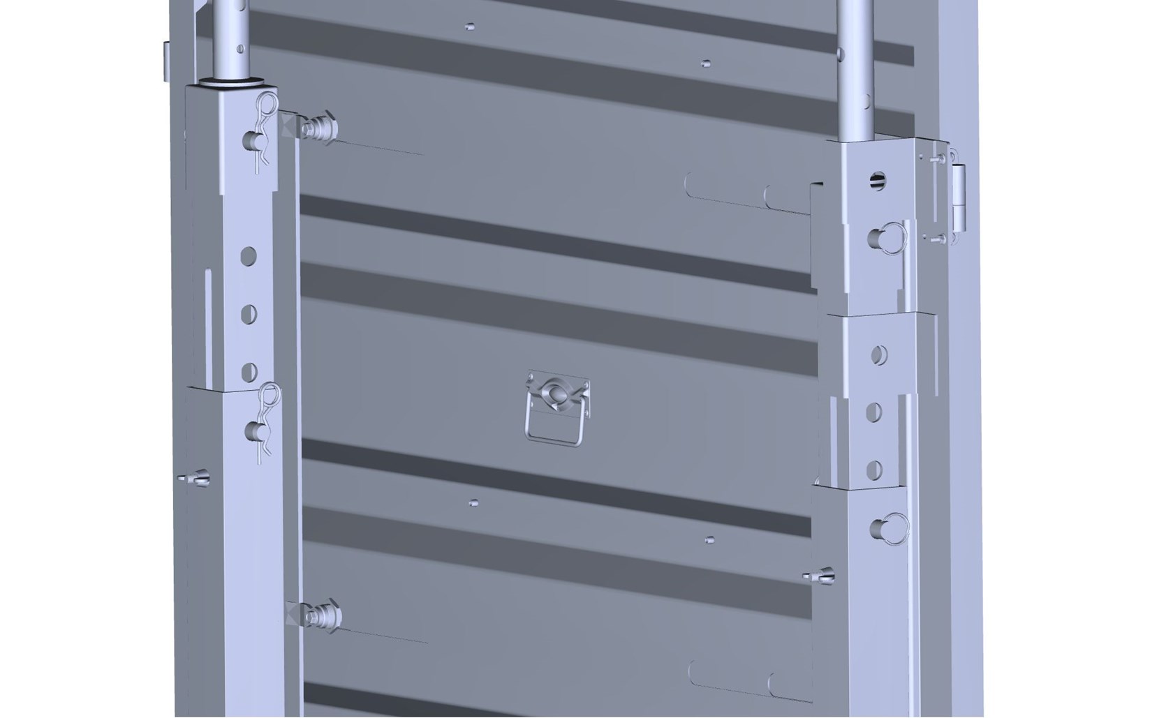 Full-surface, two-part hinged swing door made of sheet steel and aluminium. Consisting of two swing doors, each with two 3-edge locks, two vertical aluminium supports crimped between the threshold and lintel as well as a transversal sill bar to secure the position.
