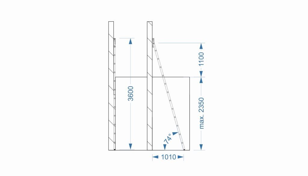 Designation Quantity Weight (kg) Exterior ladder width (mm) Number of rungs Ladder length (m) Stile dimension (mm) Design-related angle of inclination alpha Max. pit depth with angle of inclination =alpha (m) Rung dimension/rung depth (mm)