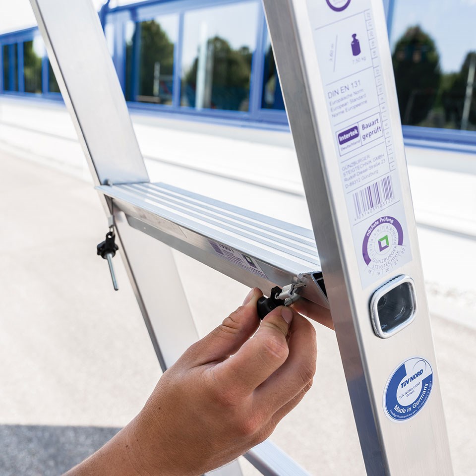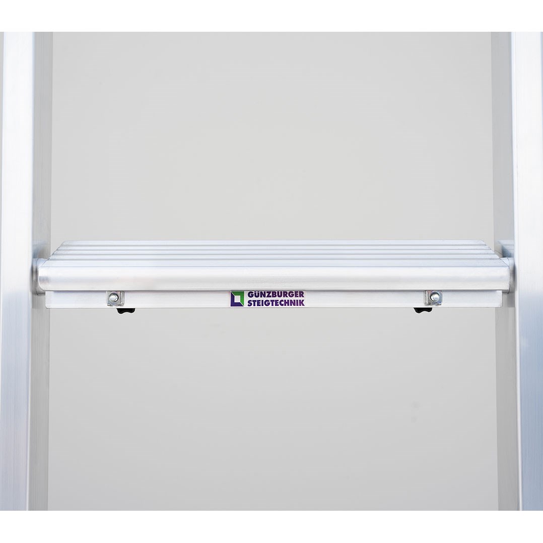 Länge 276 mm, Tritttiefe ca. 80 mm, flexibel auf jeder Sprosse anzubringen bis zur maximal begehbaren Sprosse, schnelle und werkzeuglose Montage durch Doppel-Klemmschrauben mit Haltesicherung